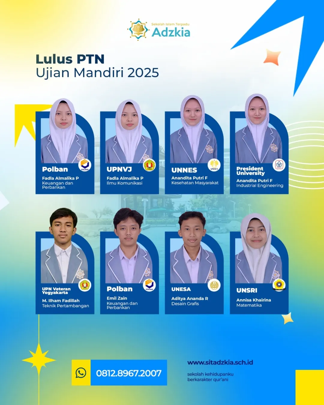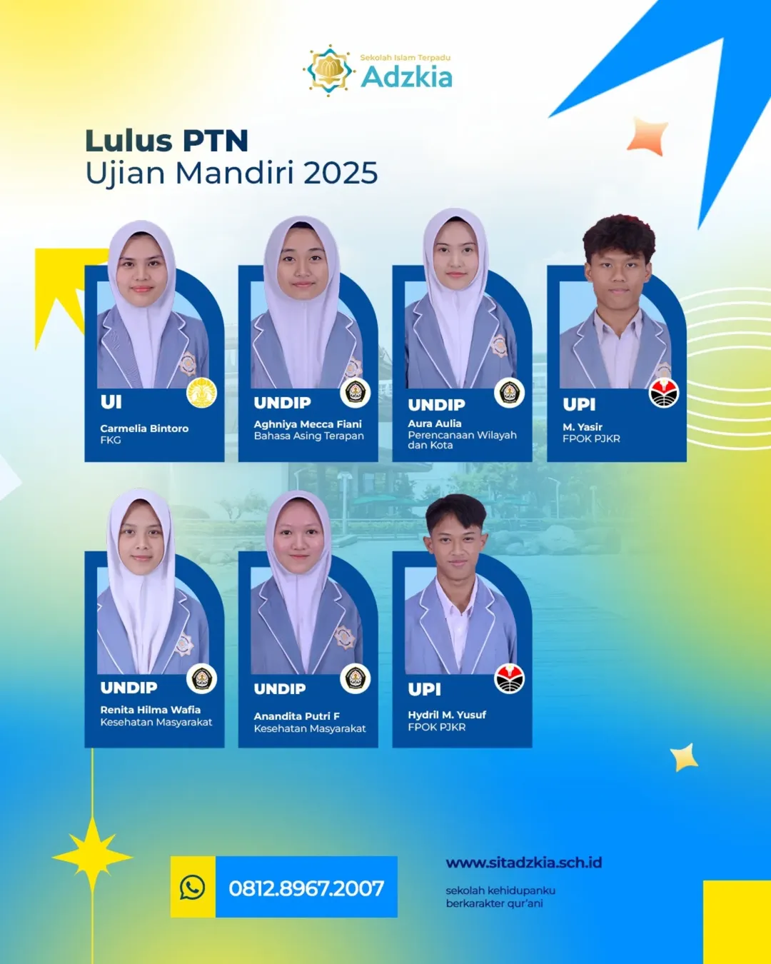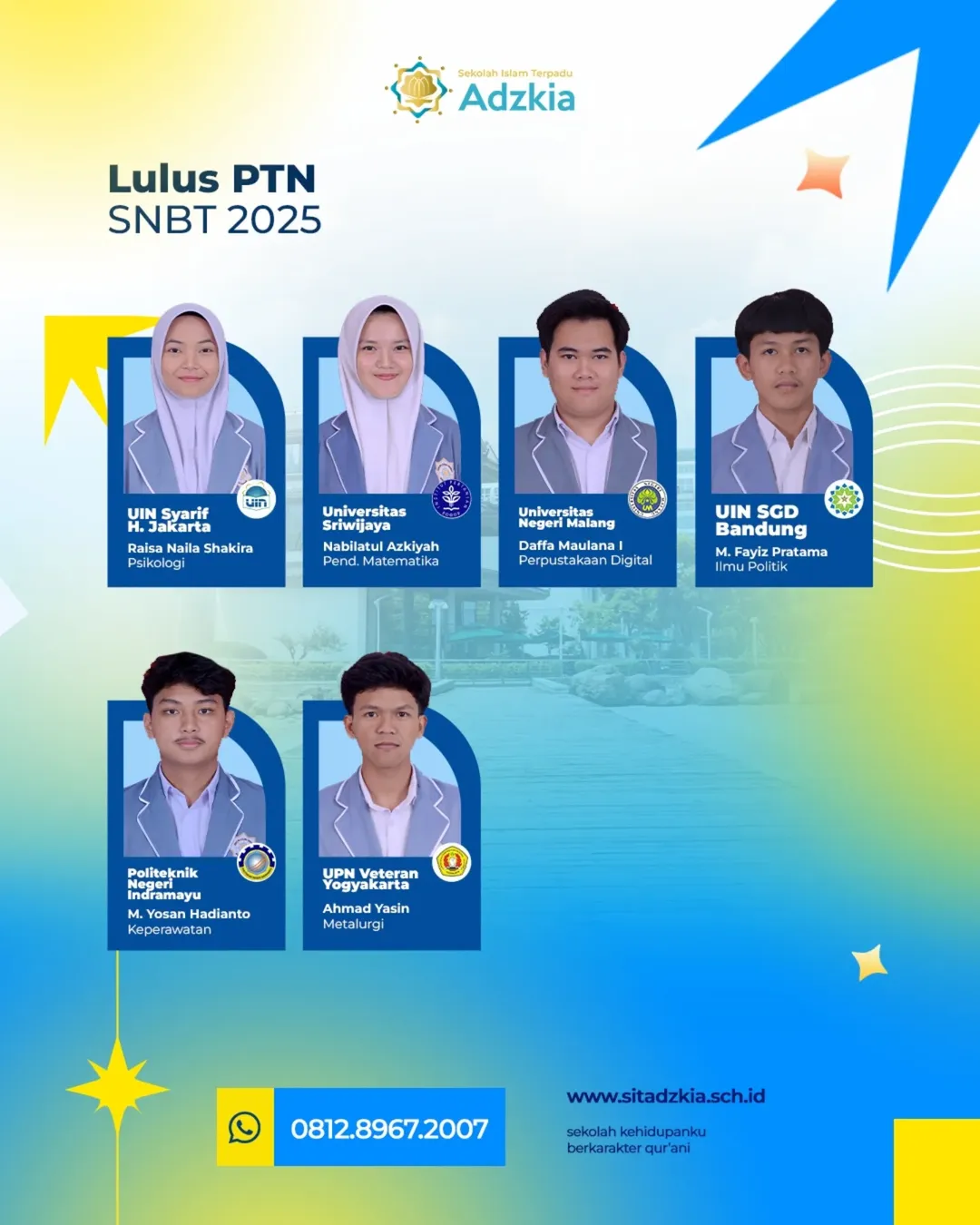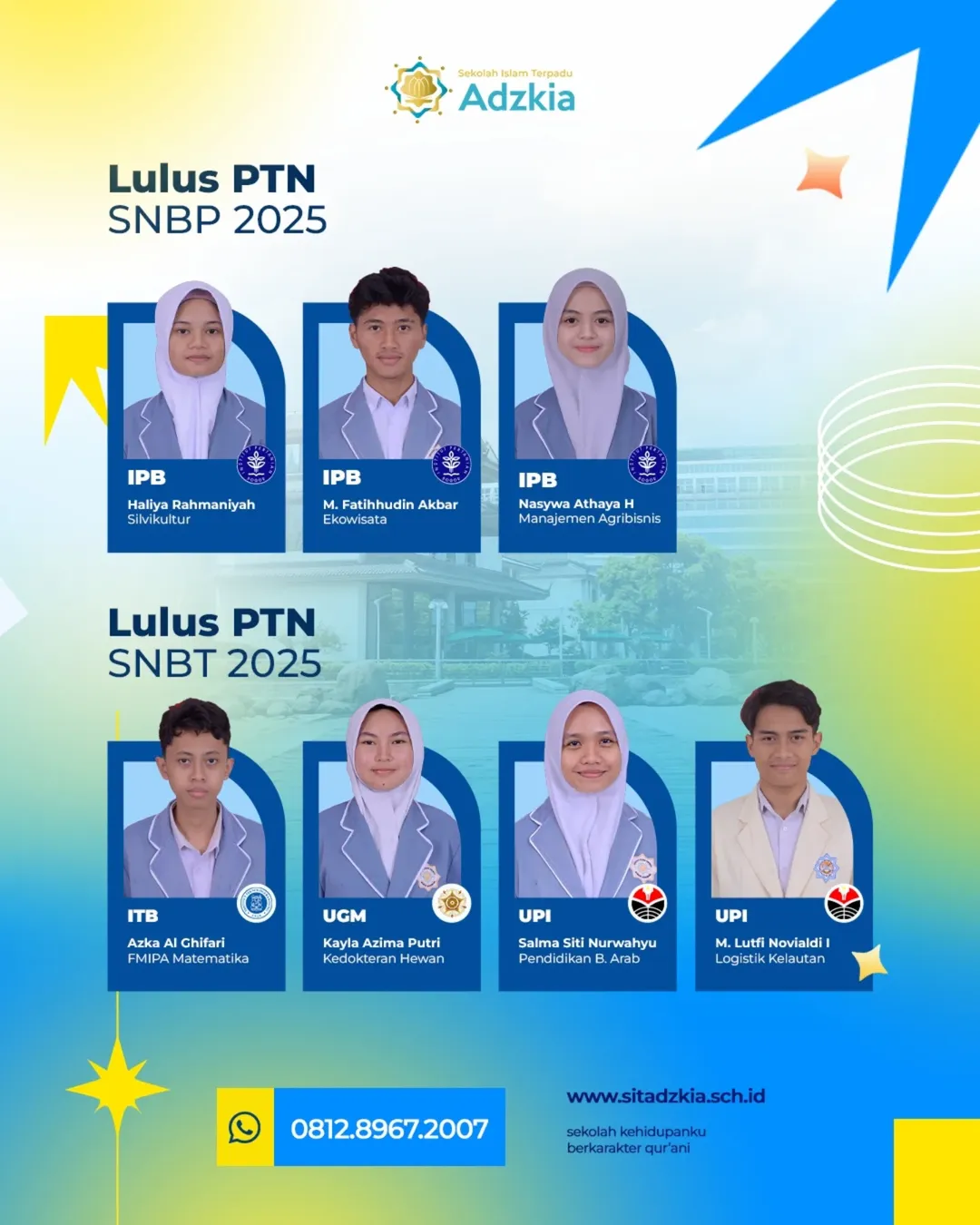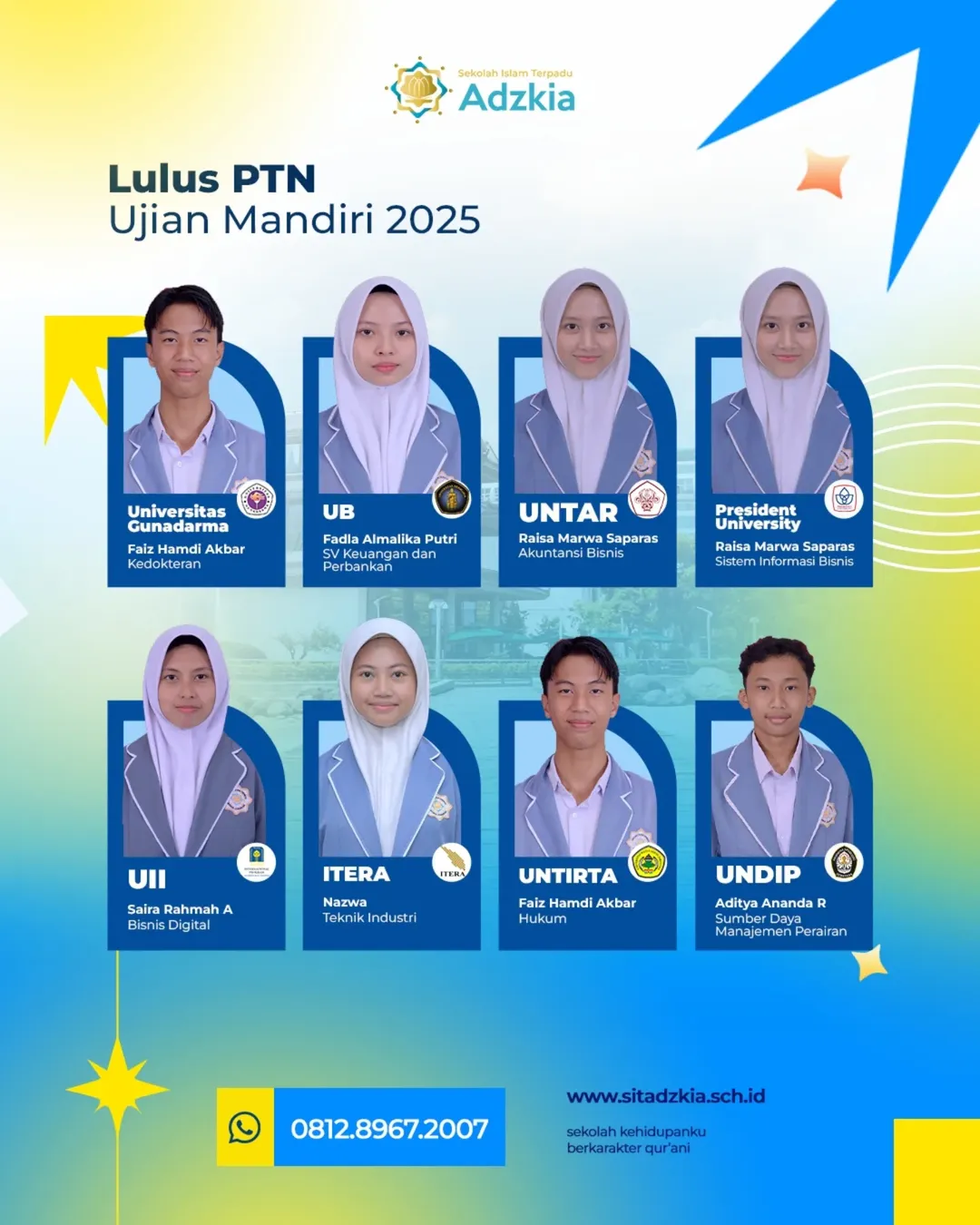 Alhamdulillah, sebanyak 58 alumni SMAIT Adzkia tahun 2025 berhasil diterima di berbagai perguruan tinggi dalam dan luar negeri. Pencapaian ini menunjukkan bahwa 64% dari total alumni kelas 12 tahun ajaran 2024-2025 telah lolos seleksi masuk kampus impian mereka. Beberapa alumni meraih prestasi gemilang dengan diterima di lebih dari satu kampus ternama, bahkan ada yang diterima oleh lima perguruan tinggi sekaligus. Hal ini membuktikan kualitas lulusan SMAIT Adzkia yang tidak hanya unggul secara akademik, tetapi juga memiliki kompetensi yang diakui oleh banyak institusi pendidikan.
